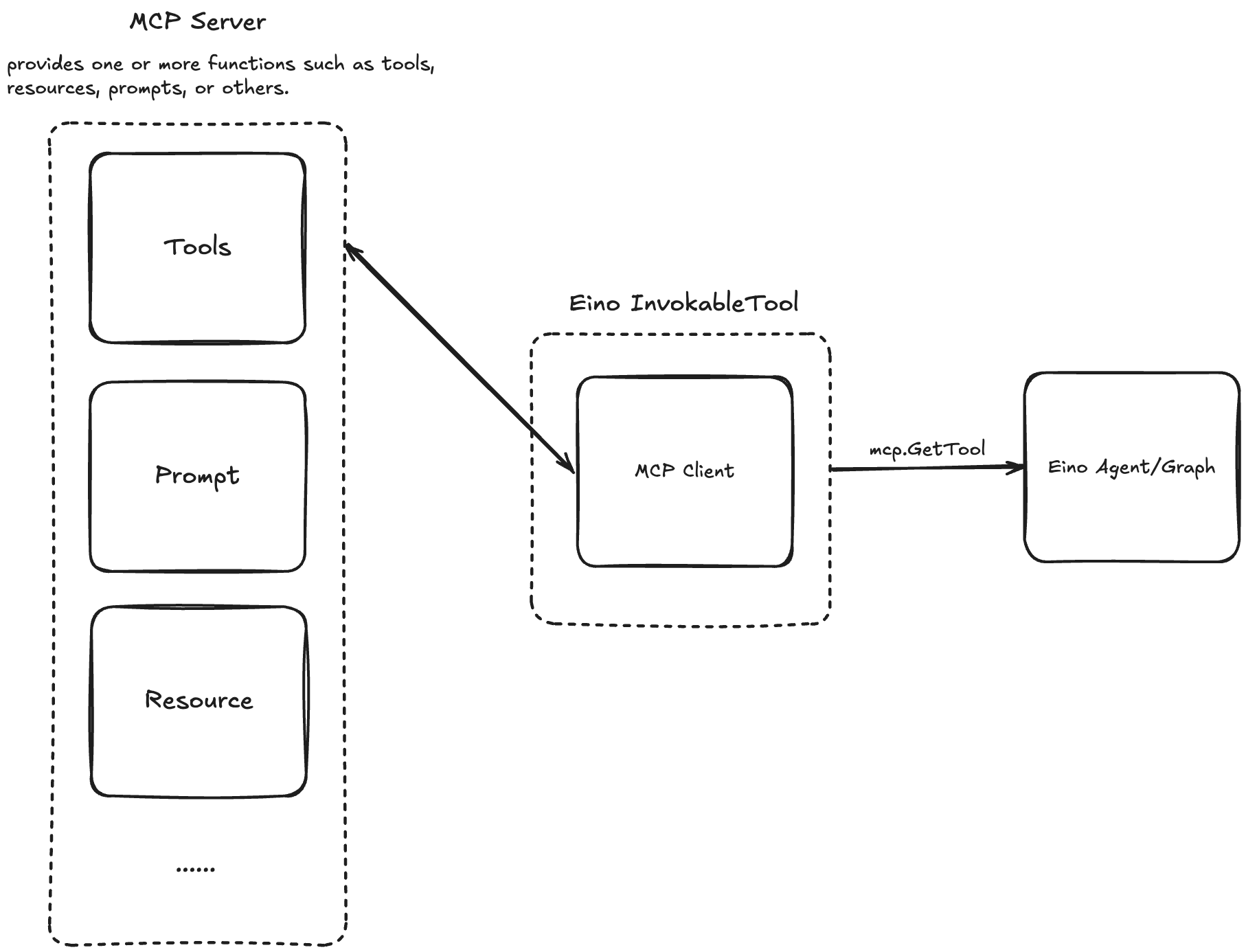 Model Context Protocol(MCP) is a standardized open protocol for model access introduced by Anthropic. Eino provides adapters, which can directly access resources on existing MCP Servers.