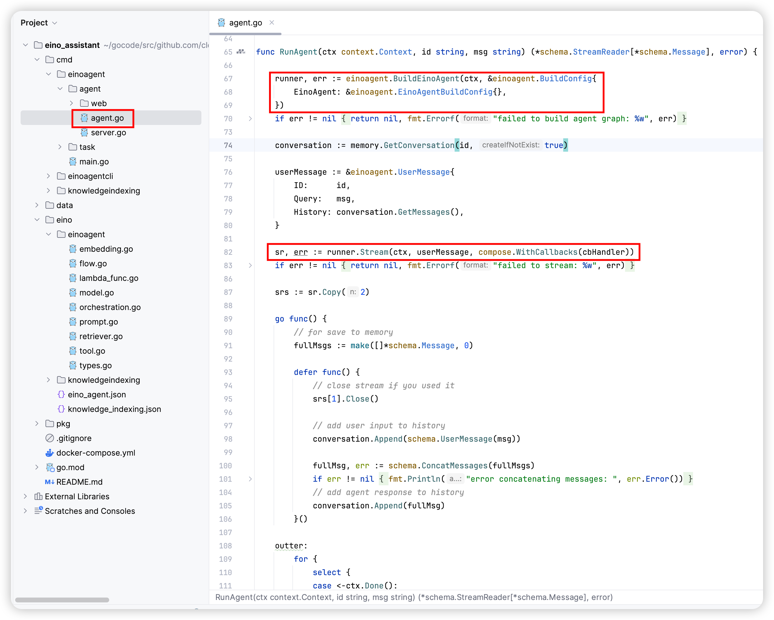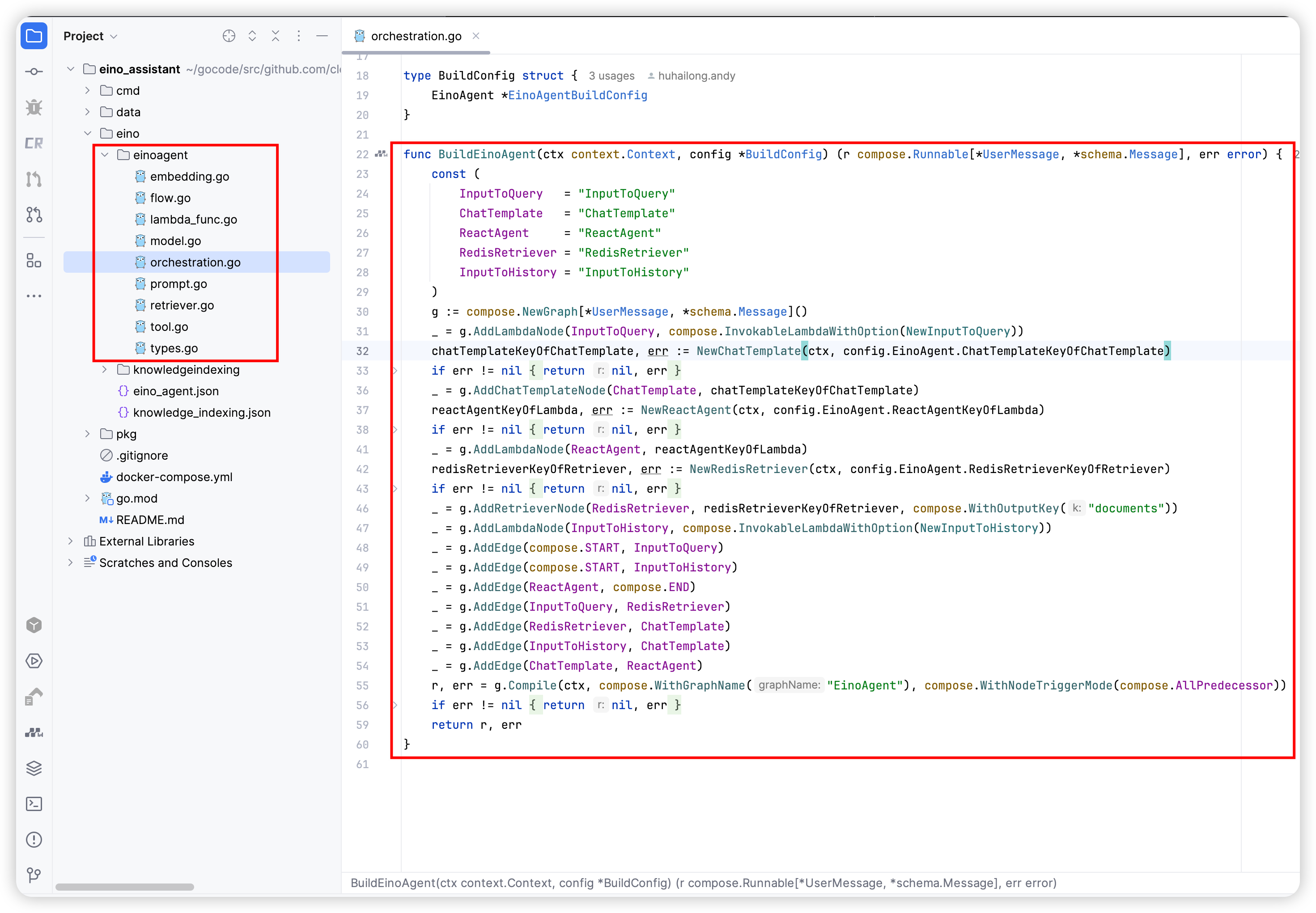 2. Once the configuration content for the components is supplemented, you can call the BuildEinoAgent method to use it in the business scenario.