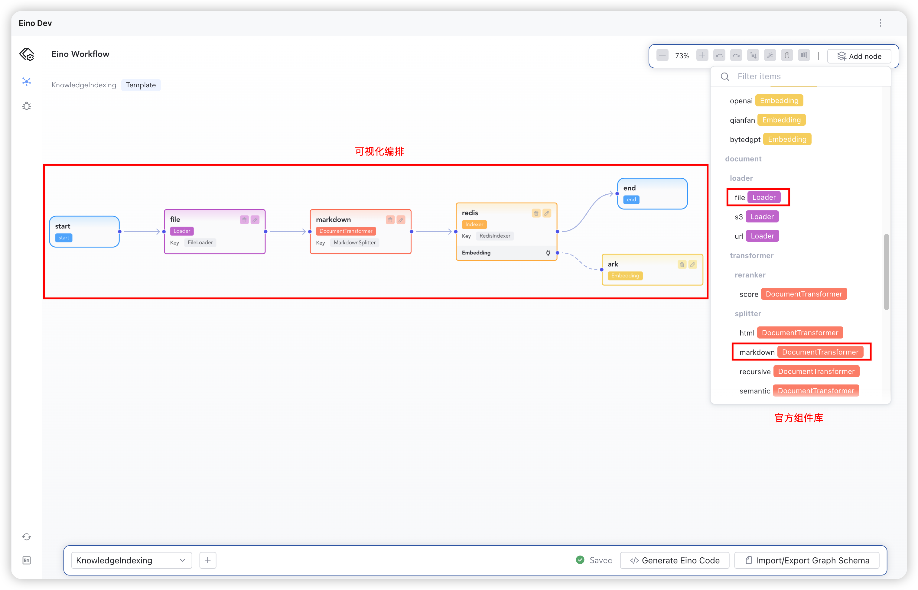 • This example can directly copy the Graph Schema from eino/knowledge_indexing.json to quickly build the graph in the example