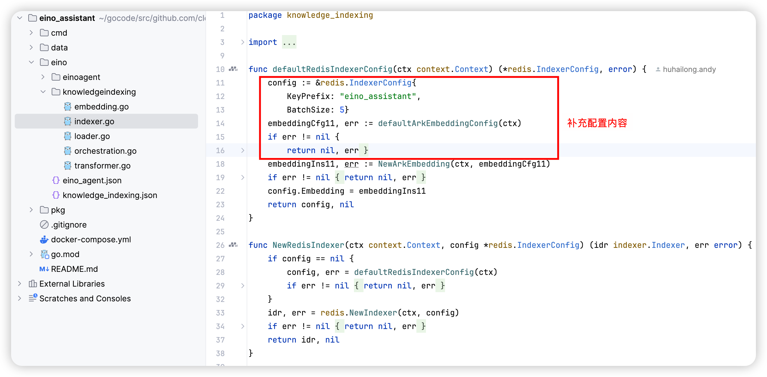 After the code is generated, first manually complete the construction methods of each component in this directory, and then call the BuildKnowledgeIndexing method in the business scenario to build and use the Eino Graph instance.