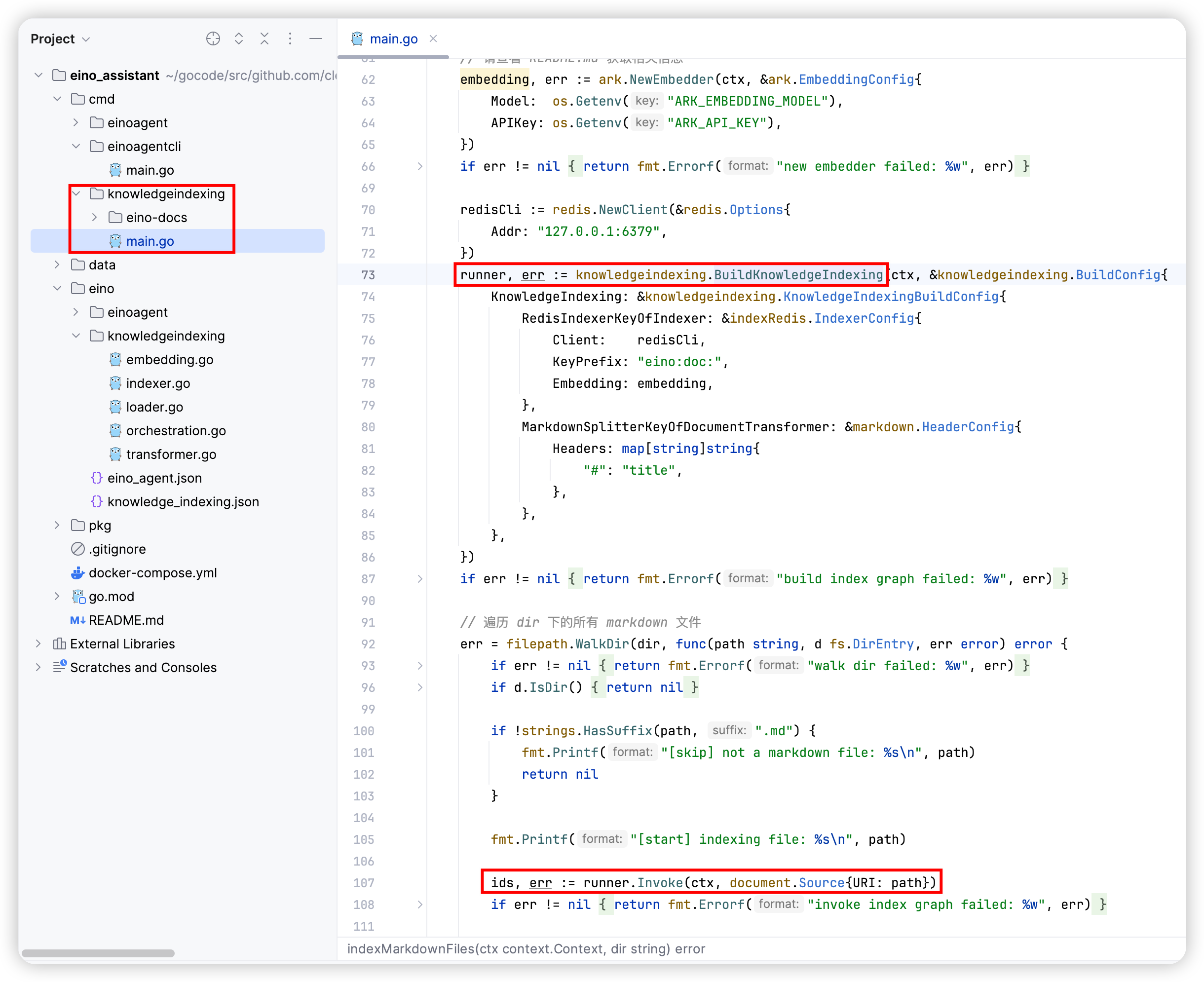 • The code for “Index Knowledge Base” is generated to: eino_assistant/eino/knowledgeindexing