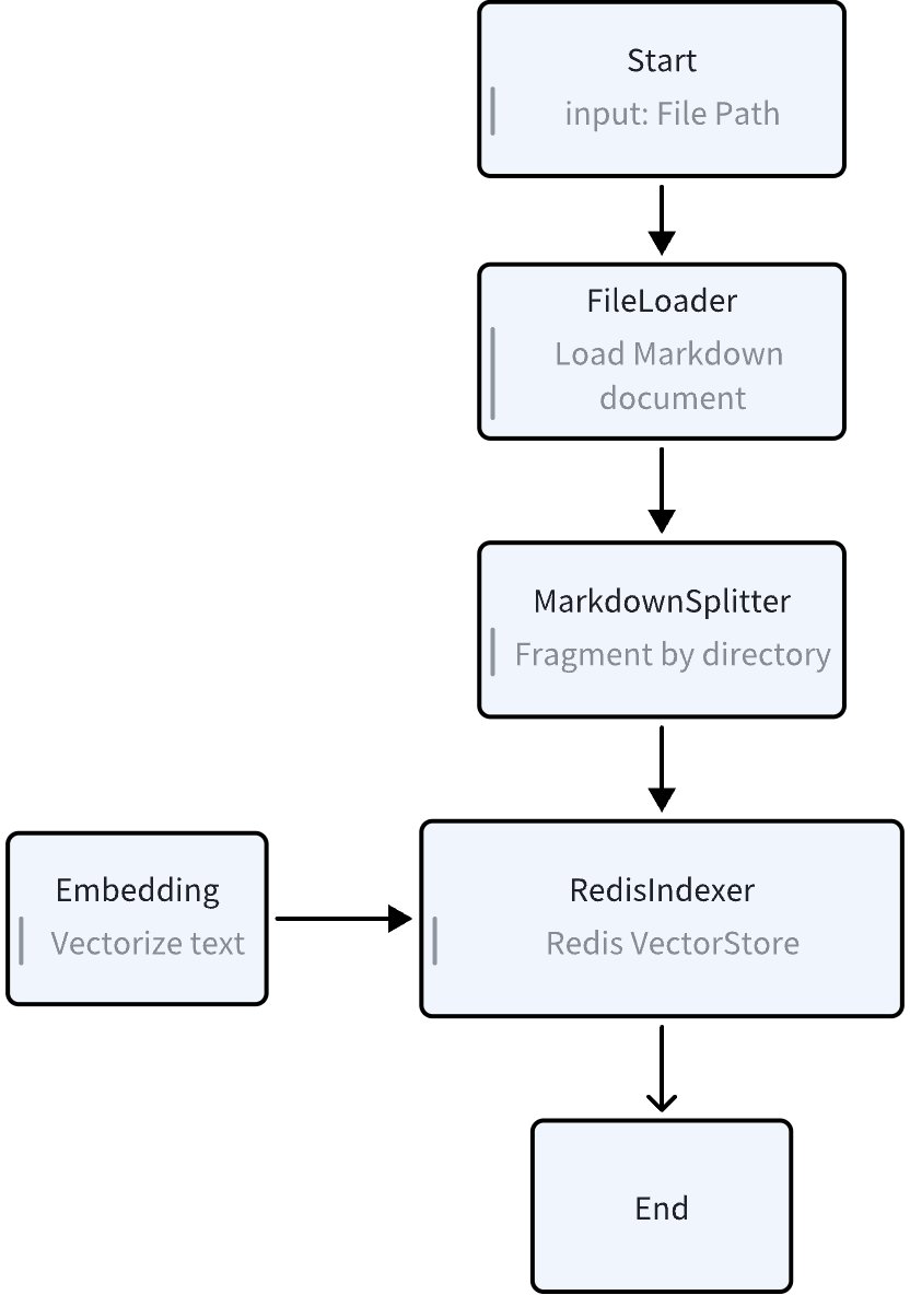 In the “Knowledge Base Indexing” scenario, BuildKnowledgeIndexing needs to be wrapped into a command, read model configuration and other information from environment variables, initialize the configuration content of BuildKnowledgeIndexing, scan the specified directory for Markdown files, and execute the indexing and storage of Markdown files.