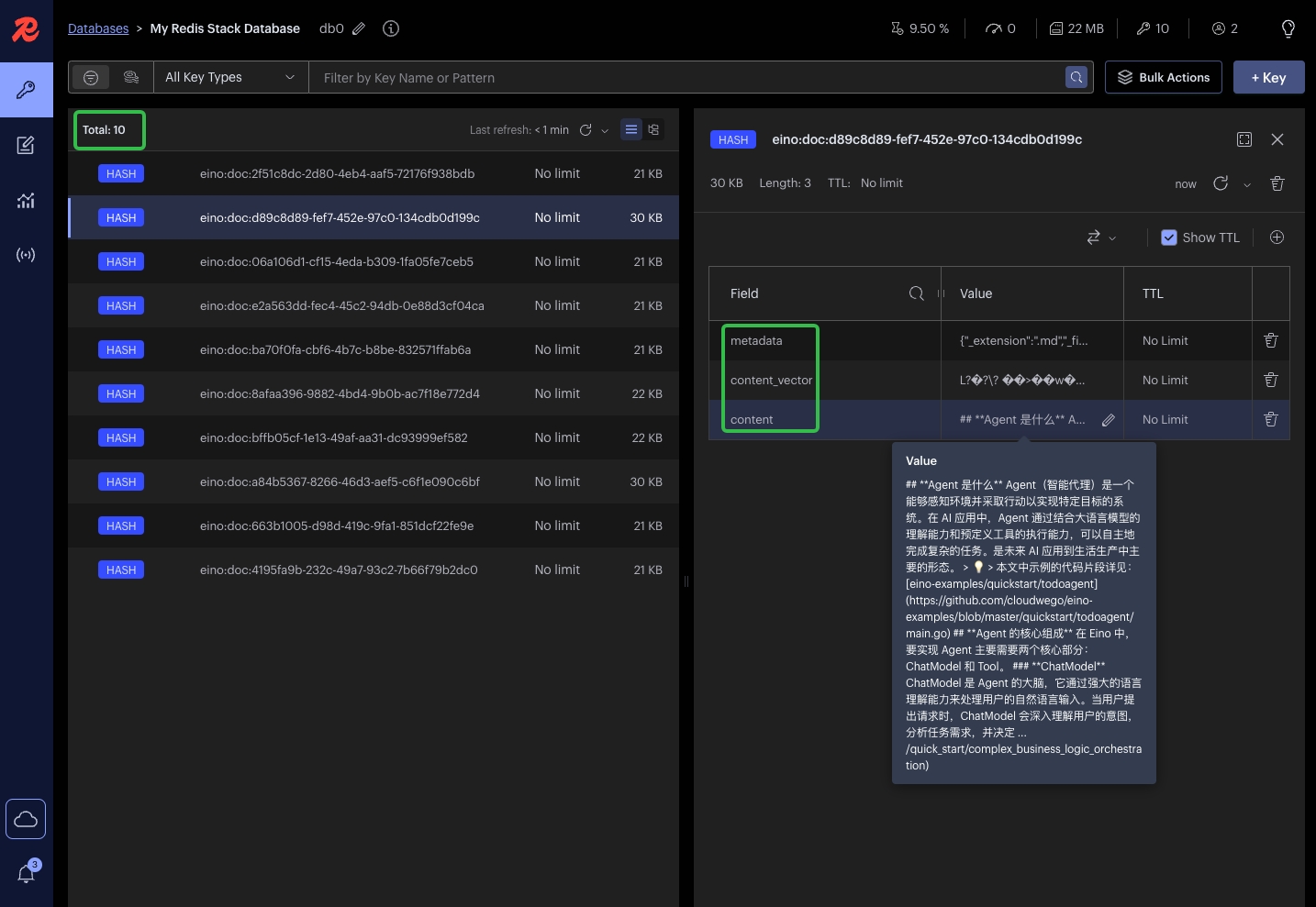 2. Once the execution is successful, the construction of the Eino knowledge base is completed, and you can see the vectorized content in the Redis Web UI.