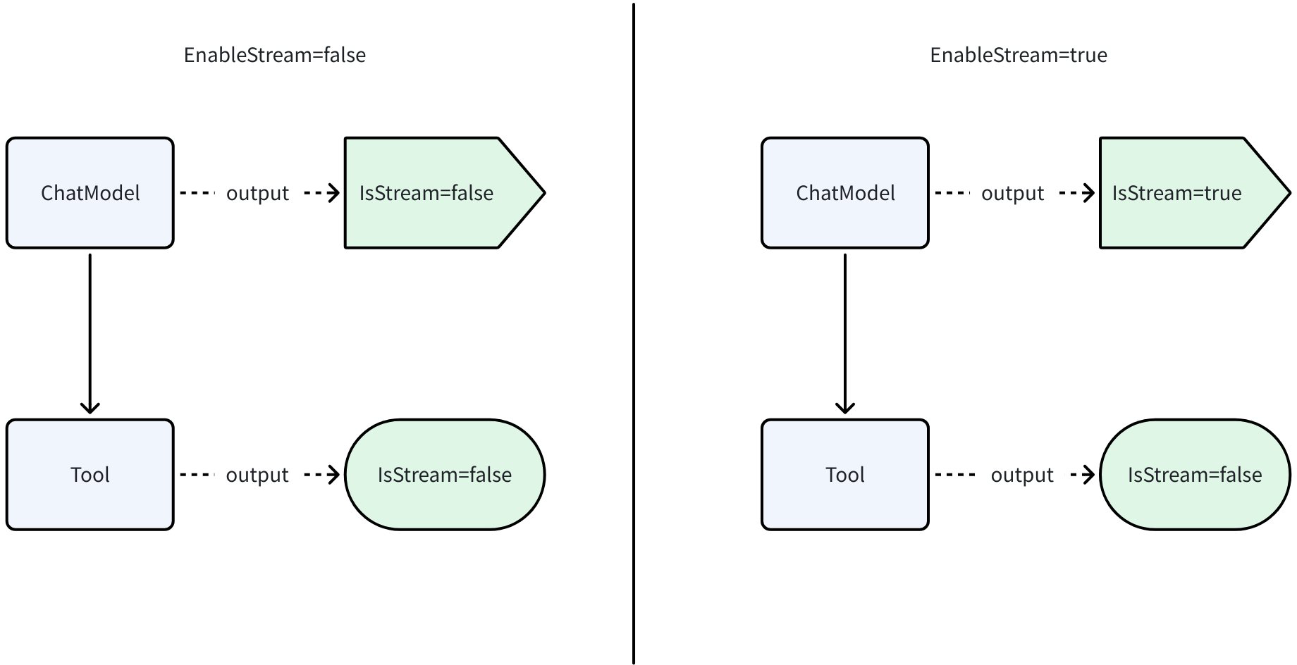 EnableStreaming 用于向 Agent 建议其输出模式,但它并非一个强制性约束。它的核心思想是控制那些同时支持流式和非流式输出的组件的行为,例如 ChatModel,而仅支持一种输出方式的组件,EnableStreaming 不会影响他们的行为。另外在 AgentOutput.IsStreaming 字段会标明实际输出类型。运行表现为: